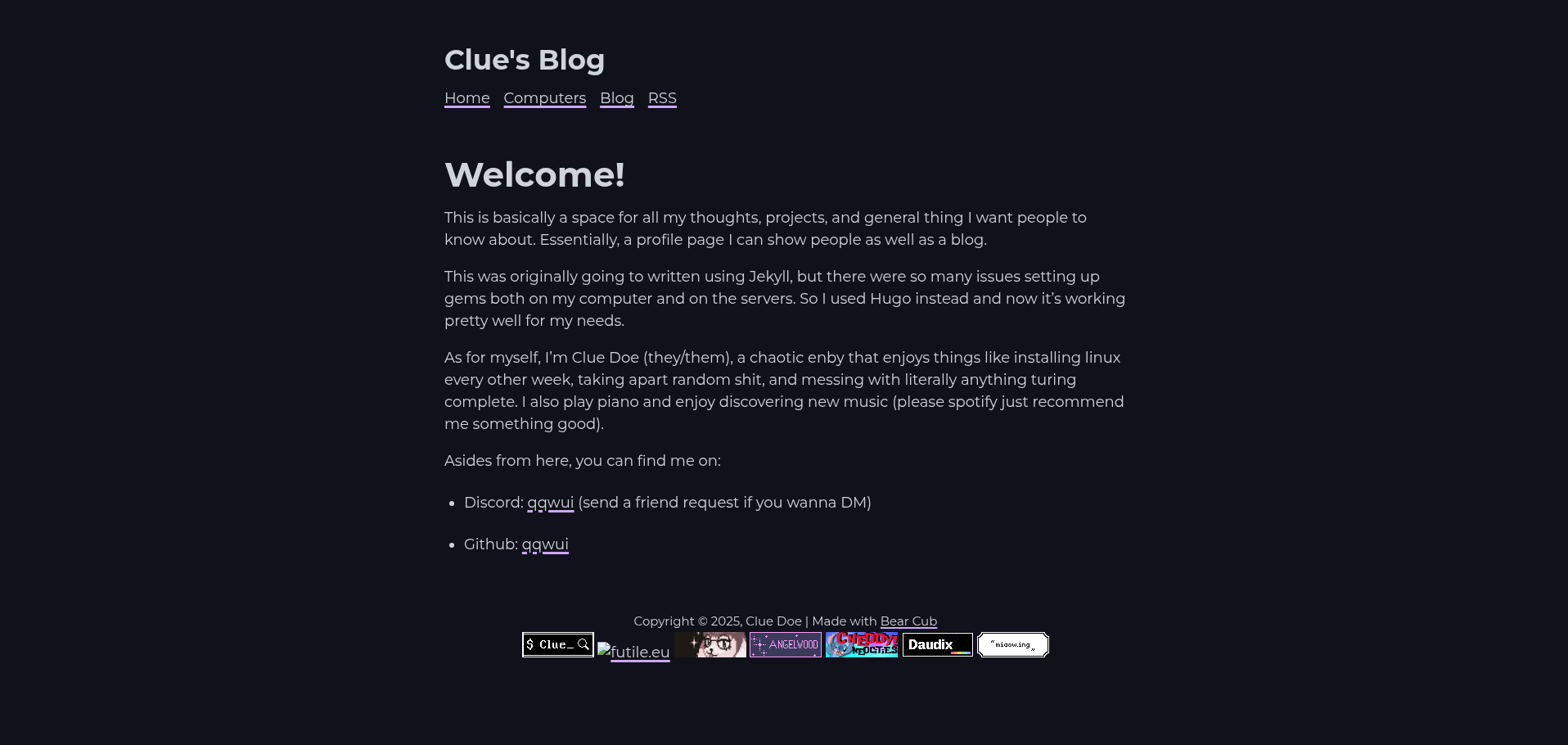 I’ve added another domain to my website now, clue.is-a.dev. cluedo.me is a free domain, but it only lasts for a year and around 6 months have already passed already at the time of writing. It’s pretty cool, but it was never gonna be permanent. clue.is-a.dev is from is-a.dev which is one of those “commit to a git repo for a free domain” and while I still don’t entirely own it, hopefully it should be way more future proof. cluedo.me still redirects to the current one, so hopefully there won’t be any dead links.